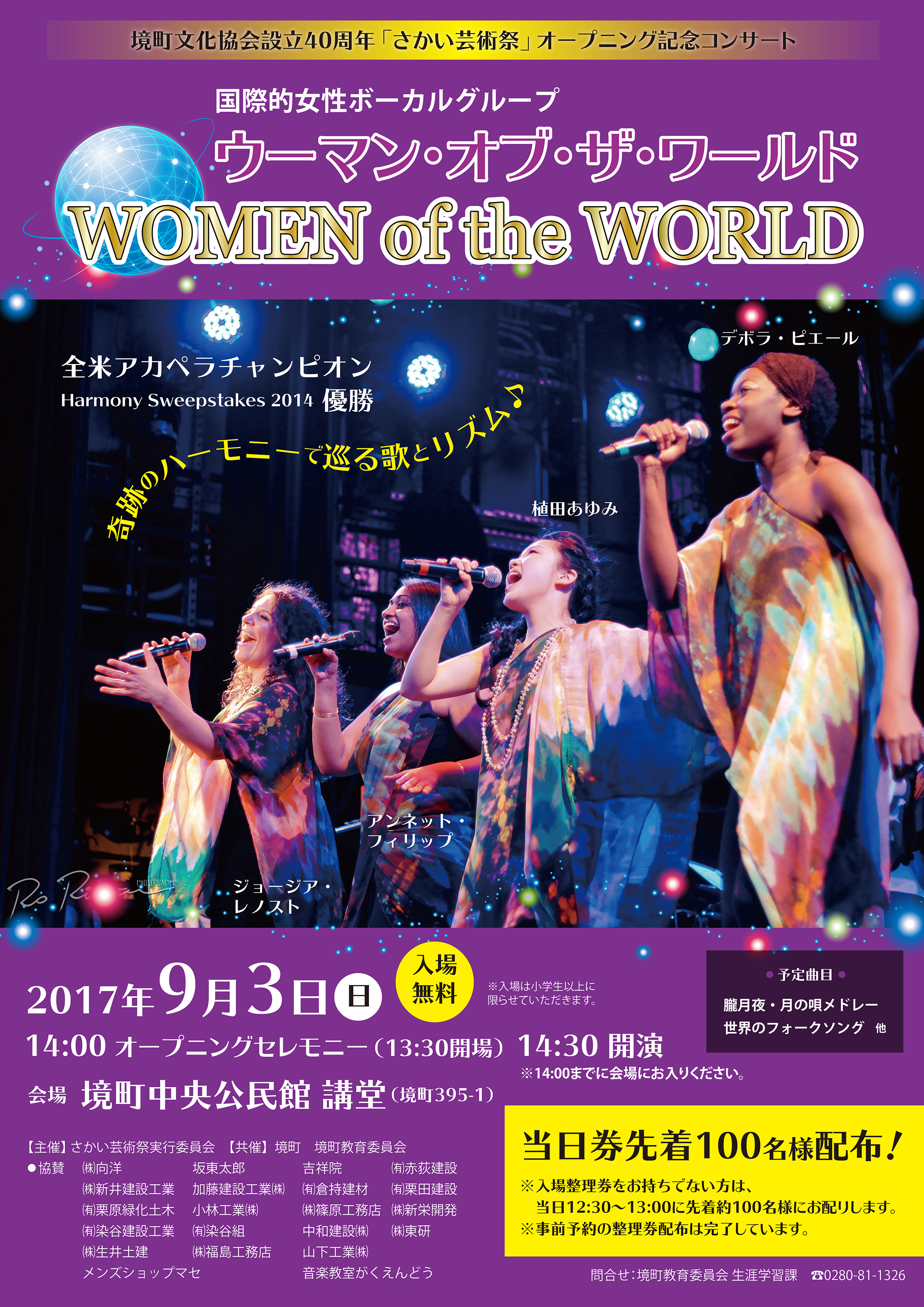 2015年の関東・東北豪雨で甚大な被害にあった茨城県境町で開催された(2017さかい芸術祭オープニング記念コンサート)にアメリカ・ボストンを拠点に活躍する国際的女性ボーカルグループ「ウーマン・オブ・ザ・ワールド」を招聘し、町民800名をご招待してのコンサートを弊社提供により行う。